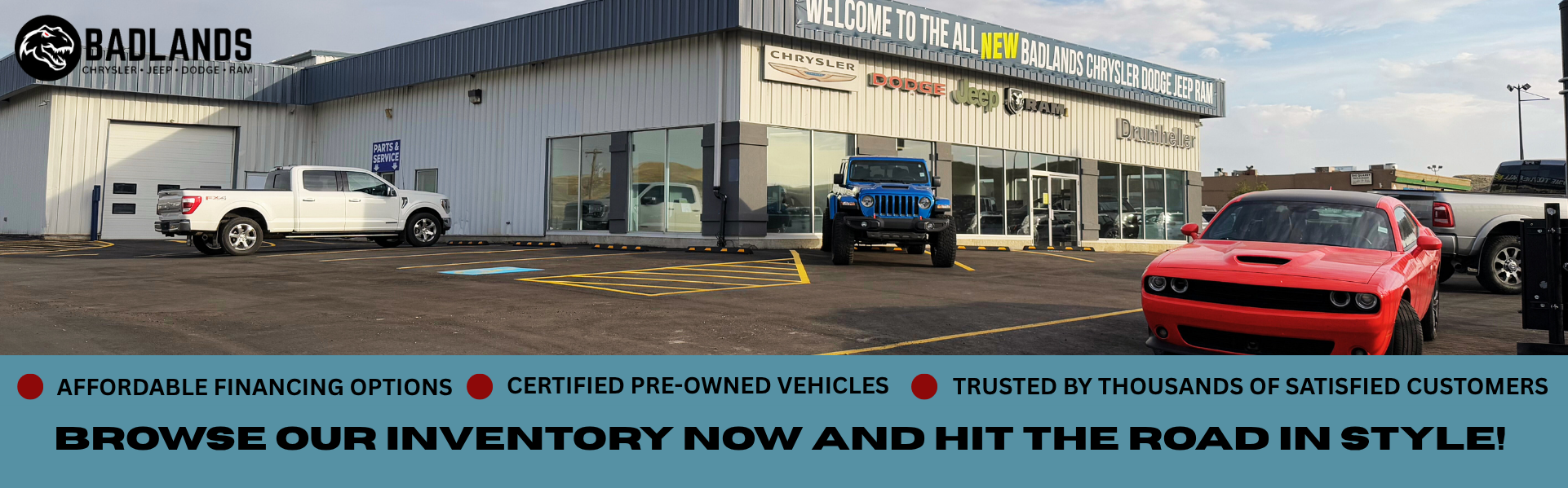 Serving the Drumheller area, Badlands Chrysler, located at 1004-Highway 9 South in Drumheller, AB, Visit us and discover why they call us “The King of the Badlands”. Our dedicated sales staff and top-trained technicians are here to make your auto shopping experience fun, easy and financially advantageous. Please utilize our various online resources and allow our excellent network of people to put you in your ideal car, truck or SUV today!